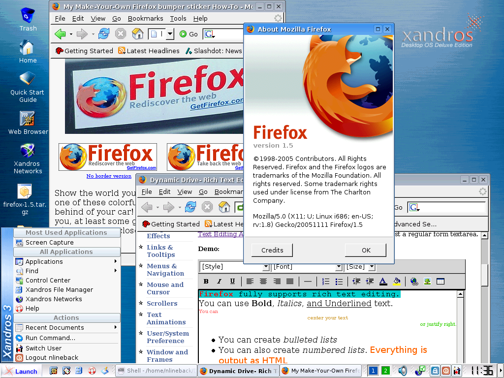 With Suse Linux and Xandros, Firefox 1.5 downloaded, uncompressed, and