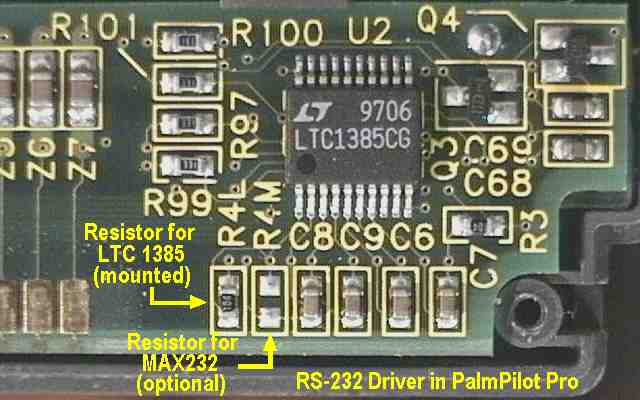 . Saving power . One feature of the Palm I loved right away, was the fully implemented RS-232. I messed around with a Psion 3A before, and never understood the concept of the clumsy adapter cable. Why didn't Psion implement the RS-232 drivers that don't take even half a square inch in SMD technology? Maybe they didn't want to loose the business with the far overprized serial adapter? Anyway, with a Psion, the adapter and a modem on the road was no fun! . Now the Palm units seem to have all included, but I see a few omissions in the design. A major drawback for sure is the high power consumption of the activated serial port. I grant Palm, that their plans with the RS-232 were merely the hot-sync, either direct or via modem, that doesn't take much time. But I blame them, not to have used an important feature of the RS-232 driver, and that because they spared out *one* line in the layout! . In general, the processor of the Palm deliveres 2 RS-232 signals (TxD, RTS) and receices 2.signals (RxD, CTS). All these signals have to be converted to and from the standard RS-232 voltage levels, nominal +/-12V. This is done by a LTC1385 from Linear Technology. The 1385 has a built-in charge pump, that boosts and inverts the 3.3V supply of the Palm. This charge pump is the main consumer when turned on. Additionally the chip has a total power down feature for minimal power consumption. Now, 3COM used only that line to control the 1385. So the only choice is driver *and* receiver on or off. With a separte line to the 'disable driver' input, a reception of signals would be possible with nearly the same power as if the whole driver is shut down. Actually this pin is already activated with a pull-up resistor of 100K, so adding one line to a free port pin of the processor would solve the problem. . What's the point, what is it good for? Well, I would love to use the Palm for all kind of logging jobs. Think about logging any telemetric values over a longer period? Or a one-way pager? Generally all applications that mostly wait for data to arrive don't need the transmitter part as long as nothing happens. I'm pretty sure, that there are some free I/O ports that could be used. A program (another Hack?) has to take care of the right signal then. . Additionally I don't understand in the moment, where the power drain comes from anyway. The data sheet of the LTC1385 talks about 0.2mA when fully powered, but unloaded. Talking about values, the unloaded RS-232 port draws around 7mA when activated and 10-11mA with the Palm modem attached. That's 50- 70% more than without RS-232. With the extra line, the additional power consumption while recieving should be close to 0 (the data sheet talks about 0.035mA). . NOTE: All the above about the serial port are my conclusions, taken from my two PalmPilots Pro. As far as I know, especially the serial port driver in the older Pilot 1000 and 5000 were different. USR (back in that times) used a driver from Maxim, MAX3222 (Datasheet PDF). The MAX3222 and the LTC1385 are pin compatible, *except* one function: the input line enables (pin 1), they have inversed functions. While the MAX is enabled with a logical LOW; the LTC needs a HIGH. What a joke!!! I always asked myself why things like that are done! Obviously USR still keeps both options, cause for Pin 1 of the chip, there are two resistor options in the layout, one for a permanent low, one for a high level. . |