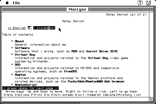 As far as I know, MacLynx is the only Web browser that runs on a Macintosh Plus that supports the HTTP "Host" header (unless you use MacWeb with MacProxy on another computer). However, it has a rather serious bug: it advertises to Web servers in the HTTP "Accept-Encoding" header that it supports pages compressed with "gzip" and "compress", but actually doesn't. When a server complies and sends back a compressed page, MacLynx complains it can't read it.
